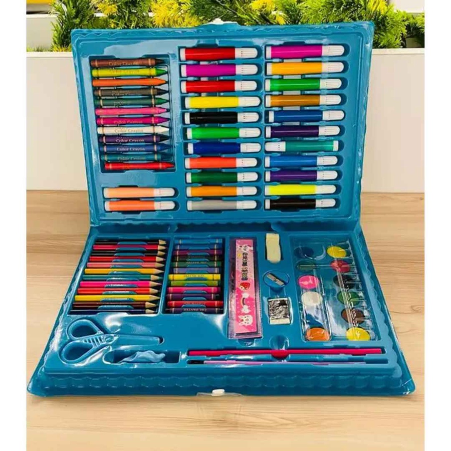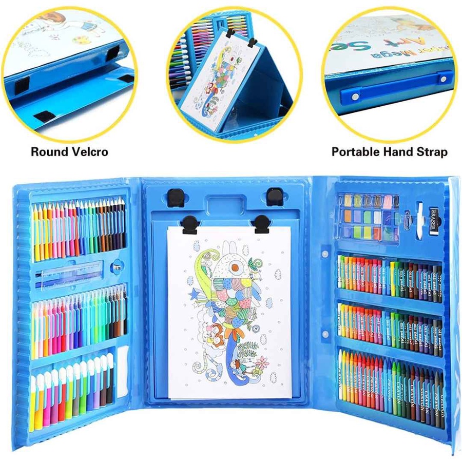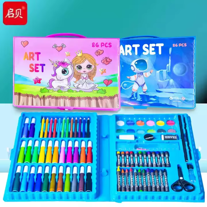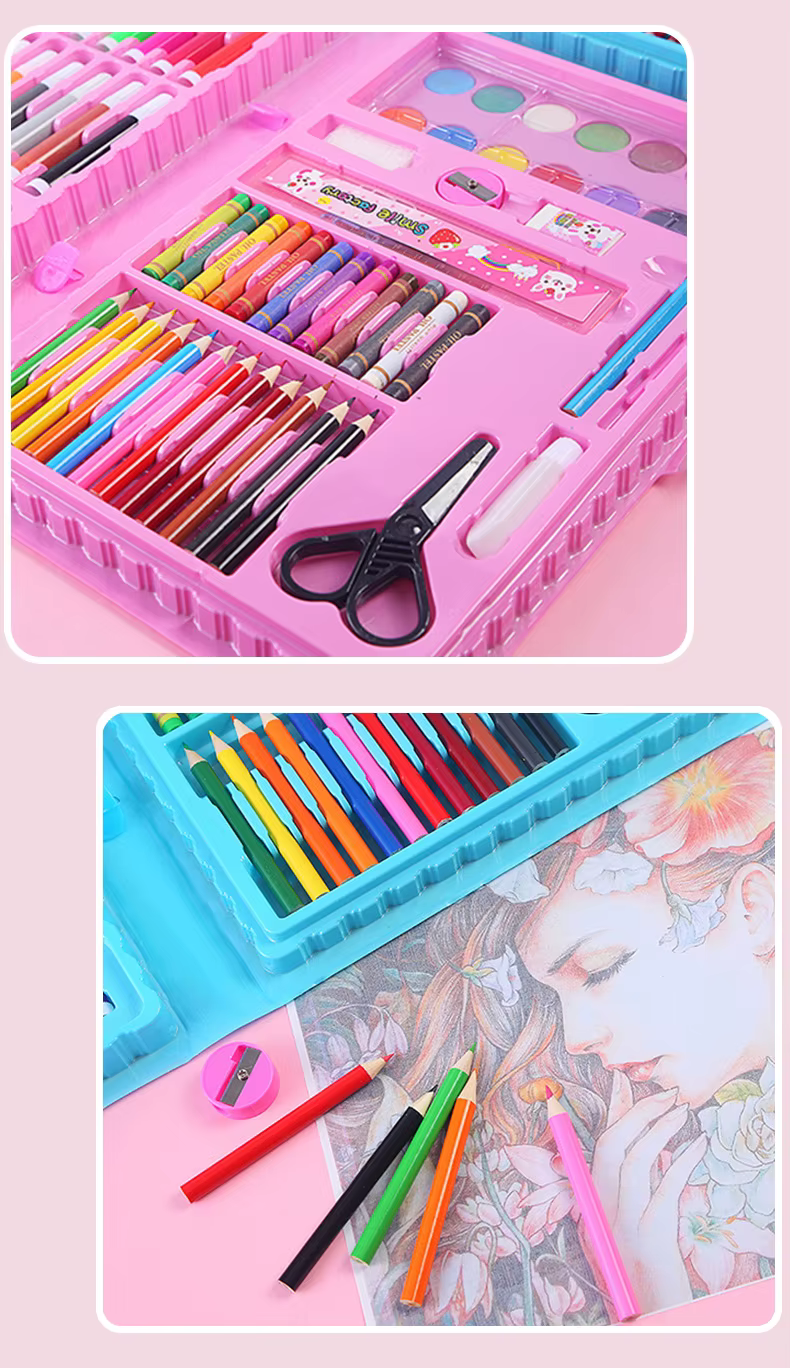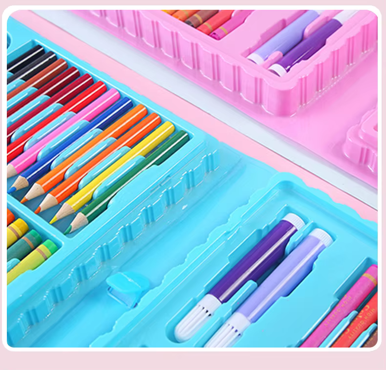 لو عايزة تشجعي طفلك يطلع موهبته الفنية وتخليه يستمتع بالرسم والتلوين، المجموعة دي هتكون رفيقه المثالي. فيها كل الأدوات اللي ممكن يحتاجها عشان يبدع ويتعلم ينسق الألوان مع بعض. العلبة كمان بلاستيك متينة عشان تحافظ على الأدوات وما تضيعش.