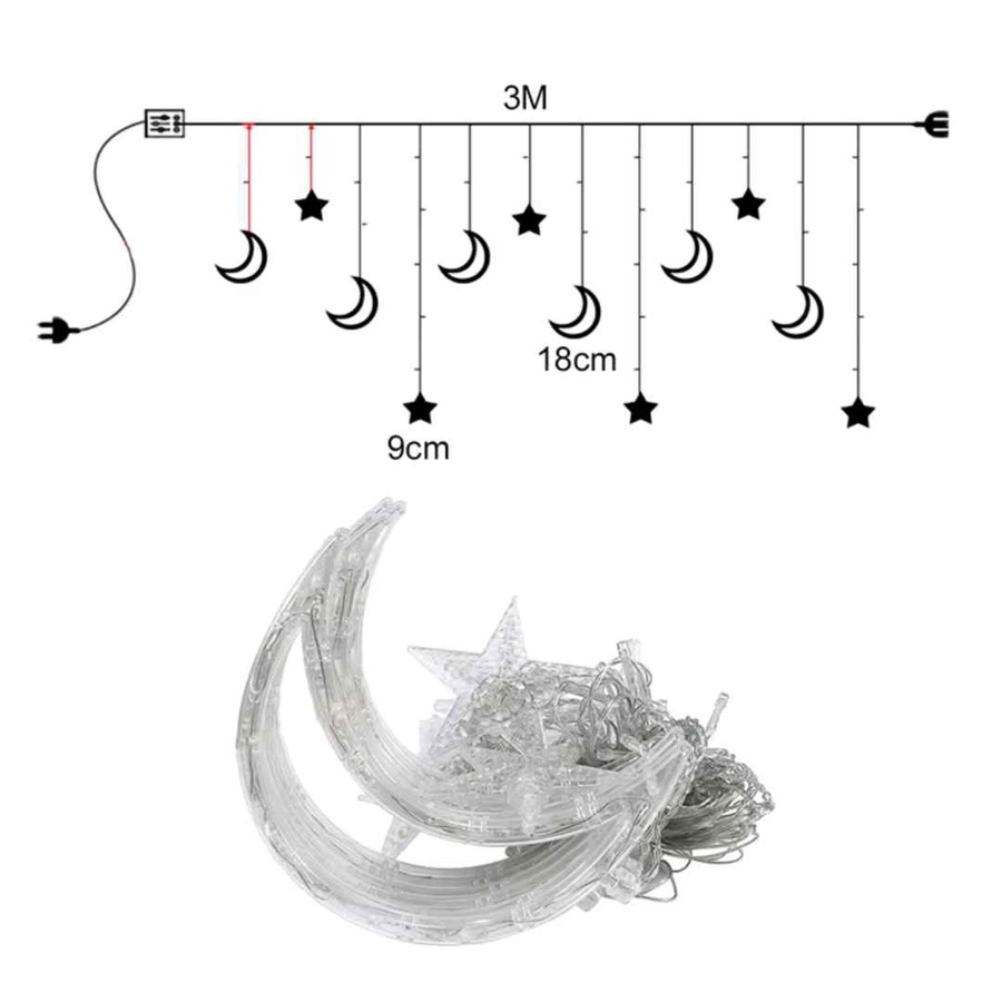 - تصميم أنيق يخطف الأنظار بإضاءة على شكل هلال ونجوم بلون أبيض دافئ يضيف لمسة مريحة ورايقة لأي مكان.